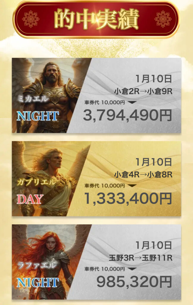 サイトに掲載されている2026/1/10付近の的中実績⇧