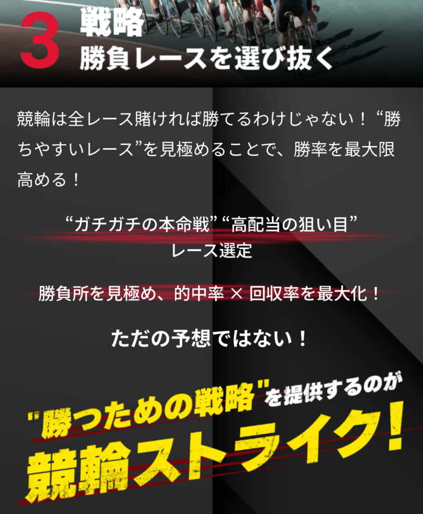 また、競輪ストライクは、独自の戦略を3つ採用しており、これにより安定したプラス収支を目指すことが可能です。短期的にも中長期的にも効率良く稼げると評判です。